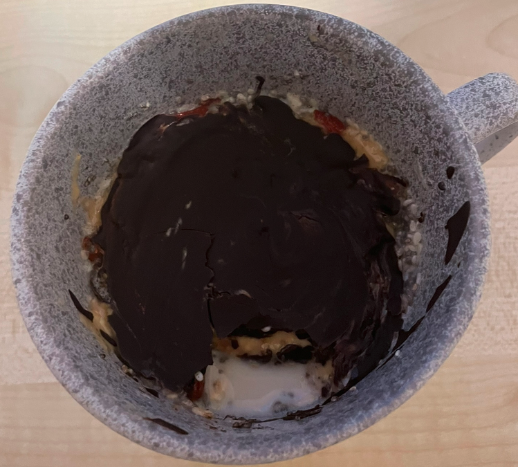 - viską sudėti į puoduką, sumaišyti ir užpilti pienu tiek, kad pasidengtų;